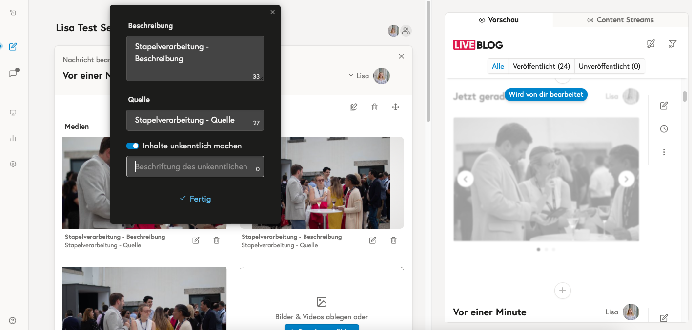 Wähle Stapelverarbeitung, um gleich eine Beschreibung und eine Quelle für alle Medien dieses Posts hinzuzufügen.