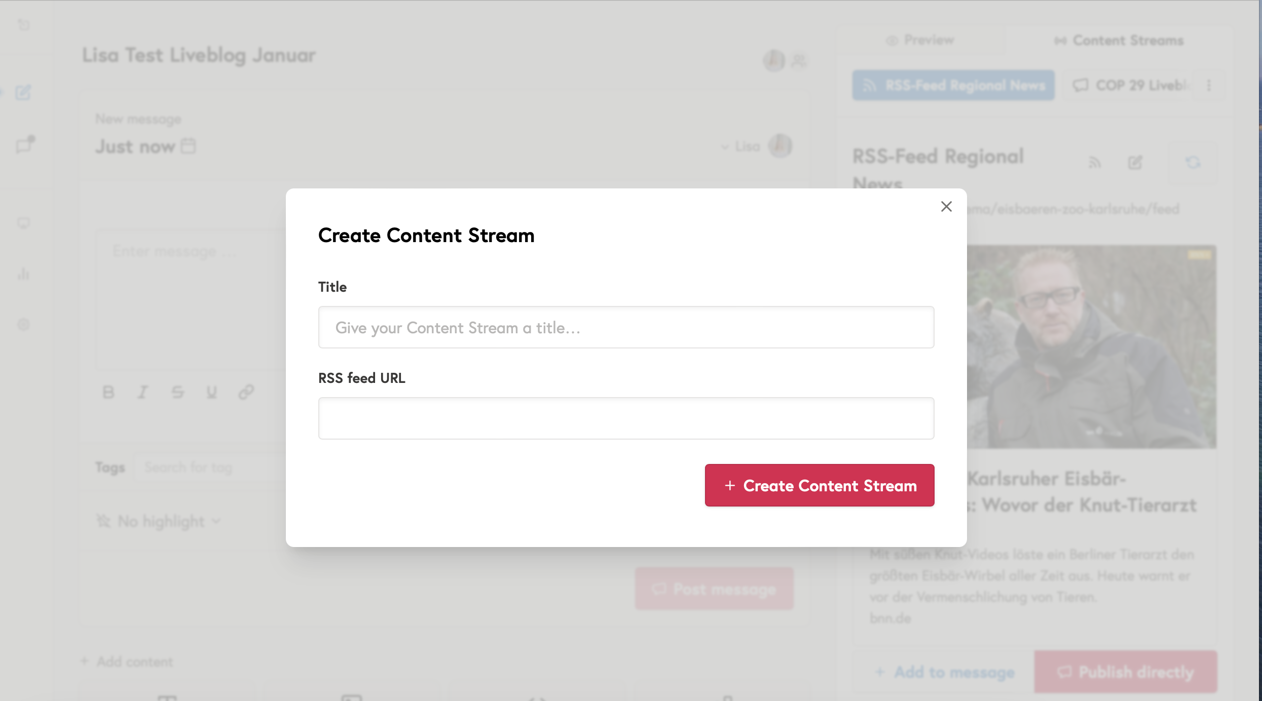 Öffne rechts oberhalb deiner Liveblog Vorschau den Content Stream und wähle "+ Content Stream erstellen". Gib dem neuen Content Stream einen Titel und füge die RSS-Feed URL ein. Der neue Content Stream erscheint nun neben der Liveblog Vorschau.