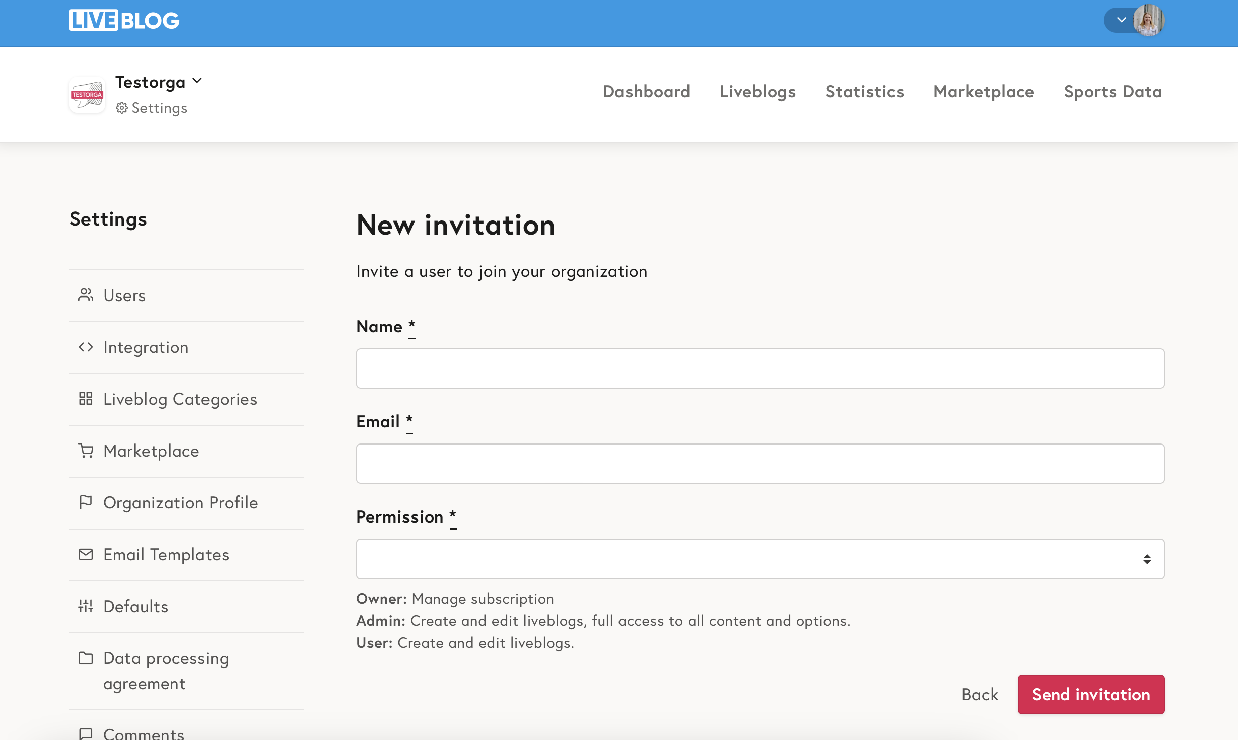 If your company already has a Tickaroo organization and you would like to create or edit content within this organization, you can be added as a reporter by the owner or admins via an invitation email.